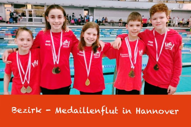 Bezirksmeisterschaft bringt 81 Medaillen Schwimmerinnen und Schwimmer freuen sich über Erfolge im Bezirk Hannover  Das Frühtraining der VfV-Schwimmabteilung in Drispenstedt hat sich gelohnt. 33 Goldmedaillen sammelten die Aktiven bei den Bezirksmeisterschaften in Hannover ein, dazu kamen 23 Auszeichnungen in Silber und 25 in Bronze. Abteilungsleiter Tom Bodenbach ist hochzufrieden mit der Ausbeute. Damit landet der…